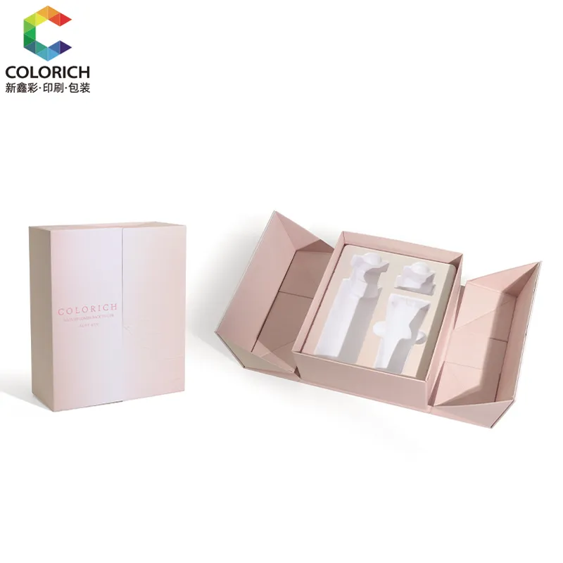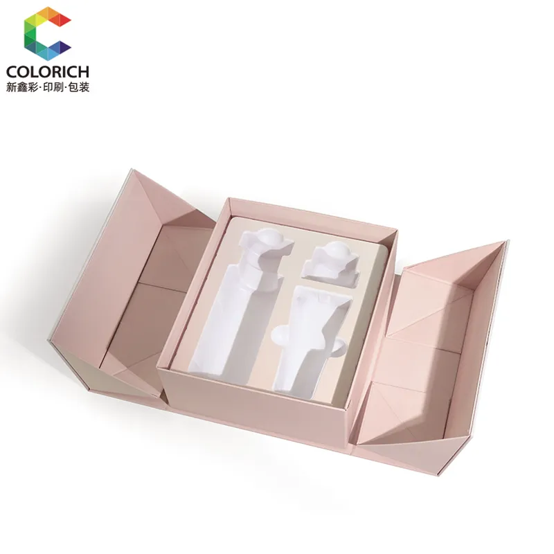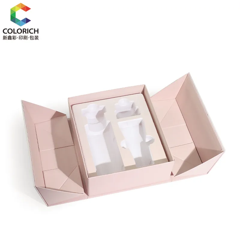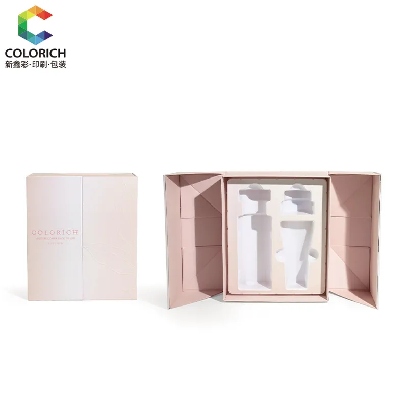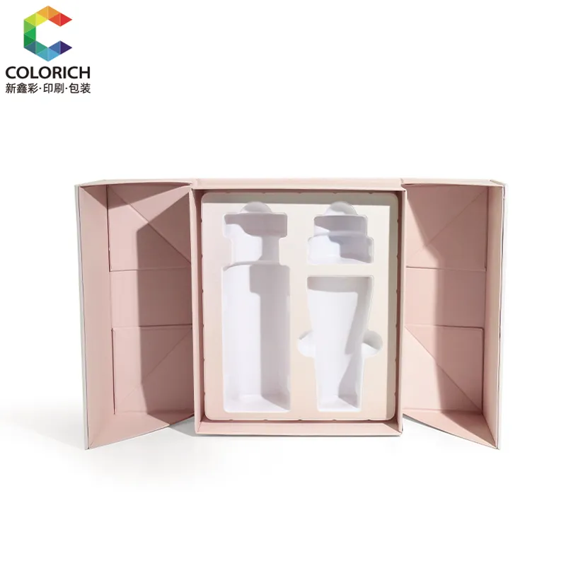 Elegant pink foldable double-door paper packaging box - This is a sophisticated and space-saving solution designed to enhance the display effect of your products. The packaging box features double-door covers, and when opened, you can see custom compartments - perfect for storing serums, creams, or travel-sized skincare sets. The double-door covers can be folded and flattened for shipping, significantly reducing transportation costs.