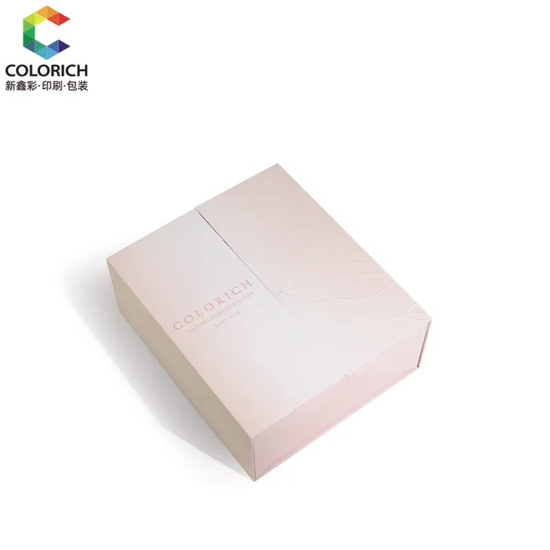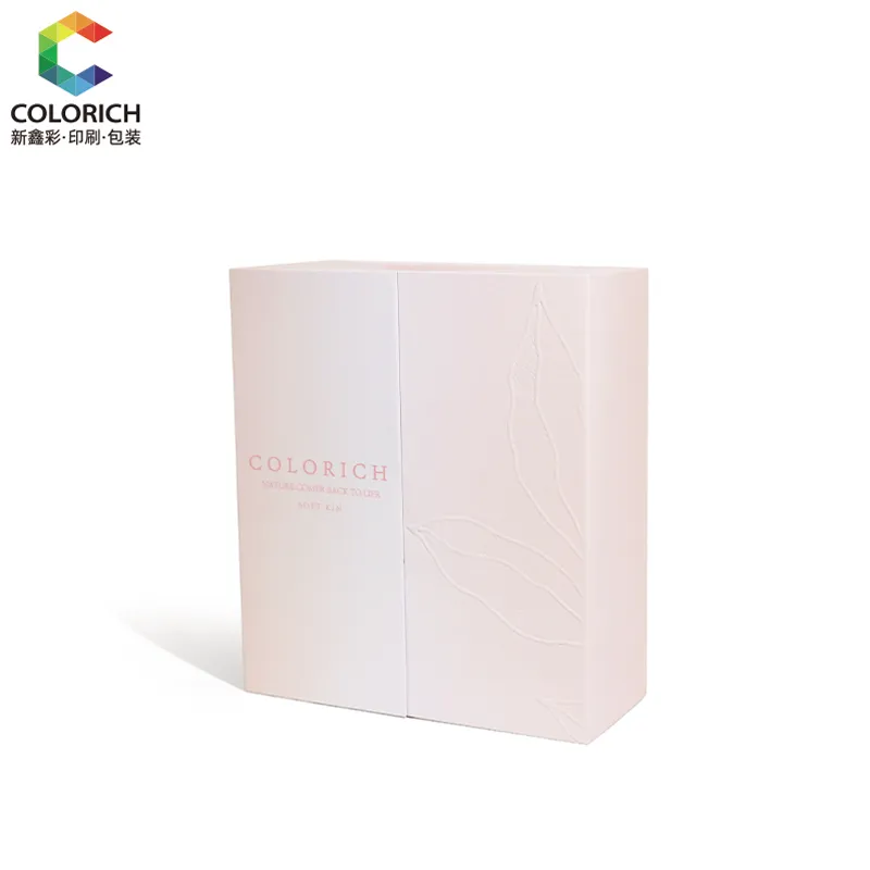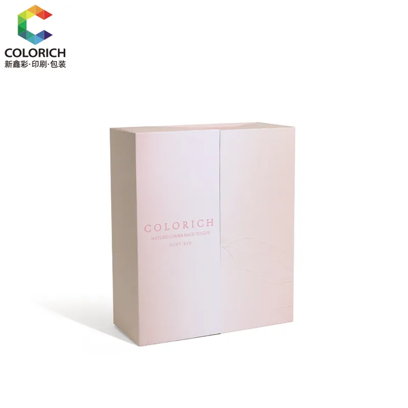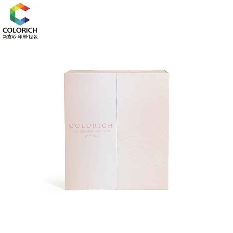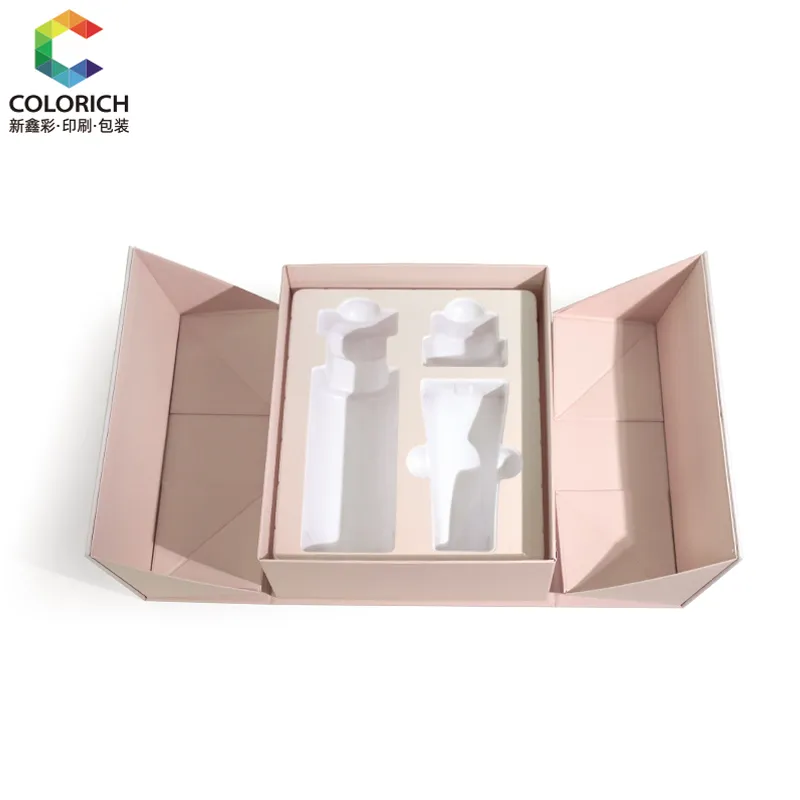 Elegant pink foldable double-door paper packaging box - This is a sophisticated and space-saving solution designed to enhance the display effect of your products. The packaging box features double-door covers, and when opened, you can see custom compartments - perfect for storing serums, creams, or travel-sized skincare sets. The double-door covers can be folded and flattened for shipping, significantly reducing transportation costs.